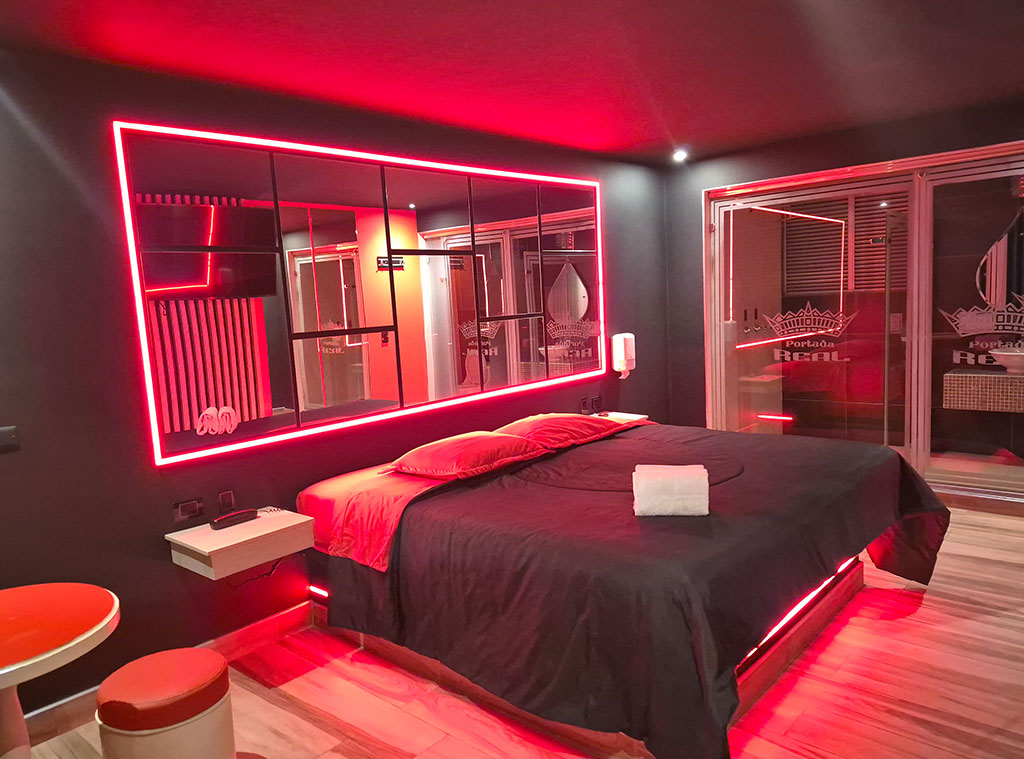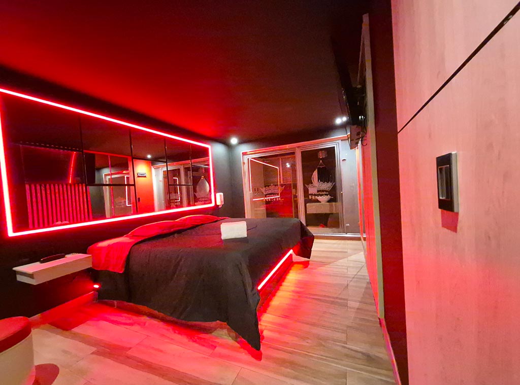 Nuestra cabaña moderna combina diseño exclusivo y confort en cada detalle. Vive una experiencia única en un espacio con luces LED de ambiente, decoración sofisticada en tonos rojo y negro, y un estilo pensado para crear momentos intensos e inolvidables.